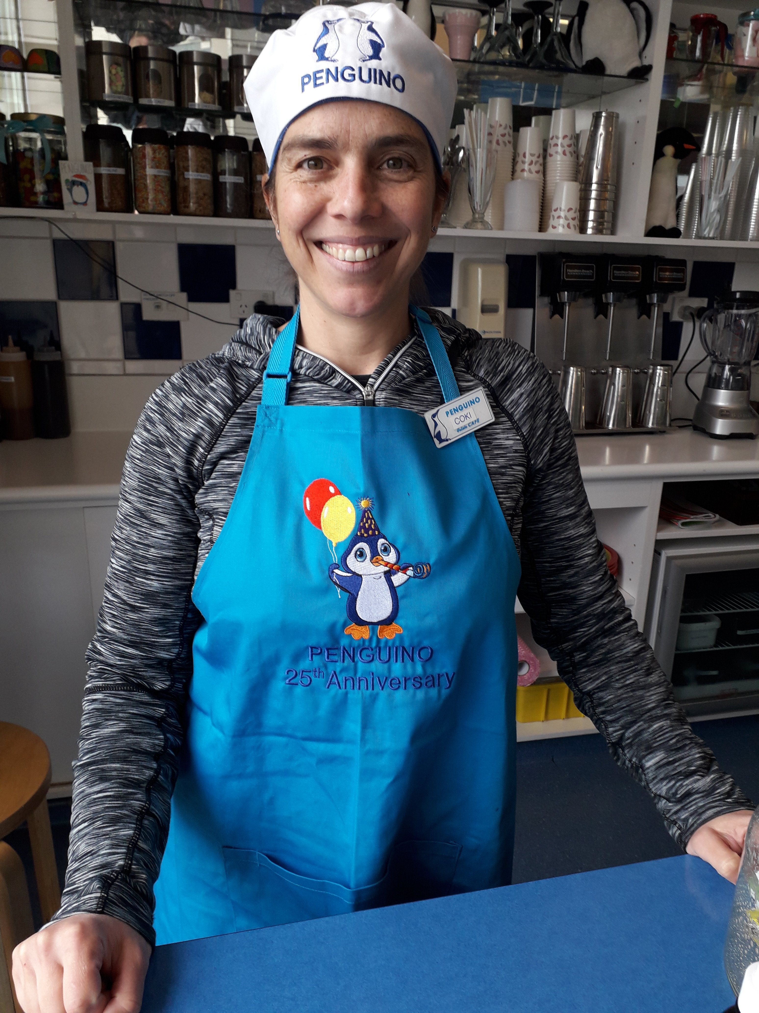When Coki asked us to help her celebrate Penguino's 25th year we custom embroidered this JB's apron.